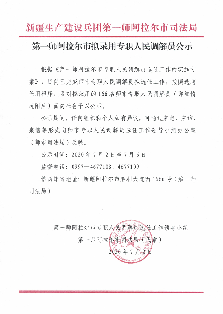 一师阿拉尔市拟录用专职人民调解员公示