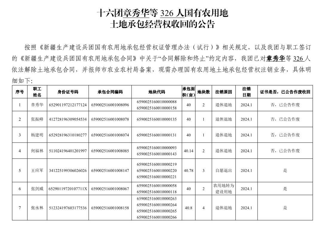 十六团章秀华等326人国有农用地土地承包经营权收回的公告