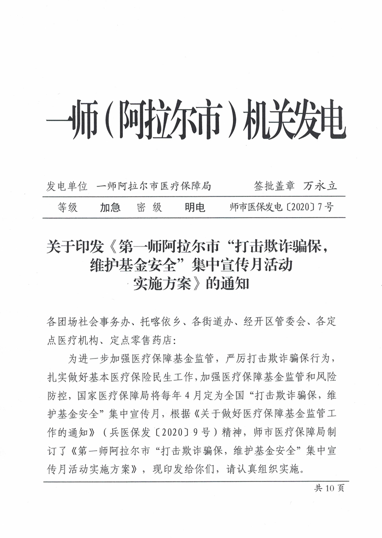 关于印发《第一师阿拉尔市“打击欺诈骗保,维护基金安全”集中宣传月活动实施方案》的通知 来源:阿拉尔市医疗保障局 发布时间:2020-04-29 16:04:41 浏览次数: 次 【字体:小 大】 【打印正文】