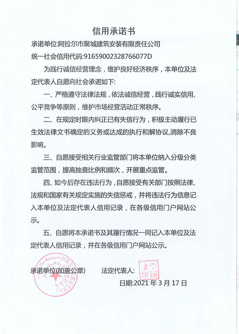 索引号: jsj-2021-00150 发布机构: 住房和城乡建设局 生成日期: 2021-04-16 废止日期: 文 号: 主题分类: 规划计划 关键词: 信用承诺书-阿拉尔市聚城建筑安装有限责任公司 【打印正文】 【字体:小 大】