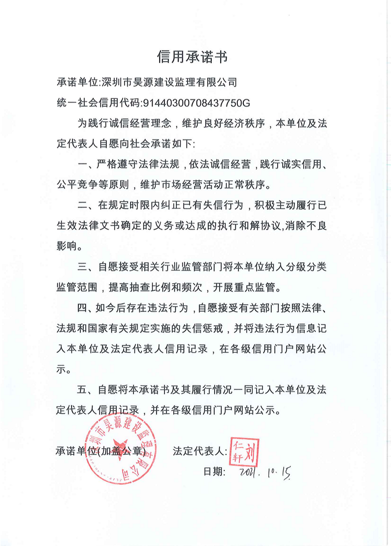 索引号: jsj-2021-00651 发布机构: 住房和城乡建设局 生成日期: 2021-10-22 废止日期: 文 号: 主题分类: 规划计划 关键词: 深圳昊源监理--信用承诺书 【打印正文】 【字体:小 大】