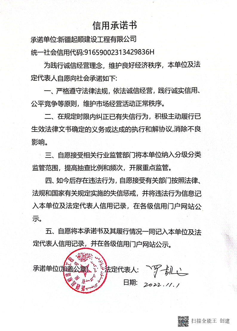 索引号: jsj-2022-00359 发布机构: 住房和城乡建设局 生成日期: 2022-12-12 废止日期: 文 号: 主题分类: 规划计划 关键词: 起顺建司--信用承诺书 【打印正文】 【字体:小 大】