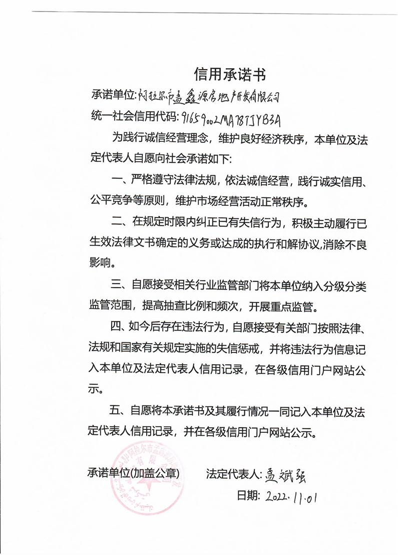 索引号: jsj-2022-00385 发布机构: 住房和城乡建设局 生成日期: 2022-12-12 废止日期: 文 号: 主题分类: 规划计划 关键词: 孟鑫源房地产--信用承诺书 【打印正文】 【字体:小 大】