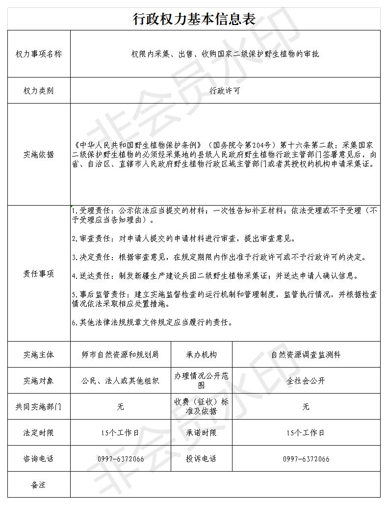 权限内采集、出售、收购国家二级保护野生植物的审批