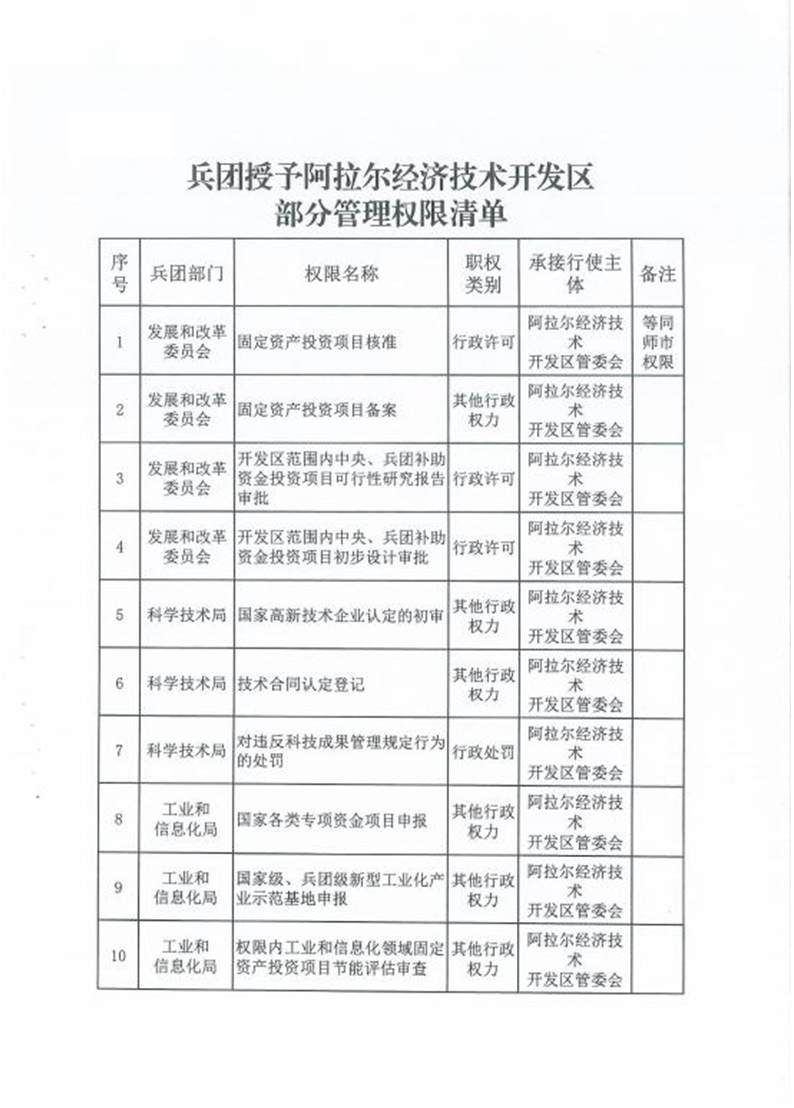 兵团授予阿拉尔经济技术开发区部分管理权限清单