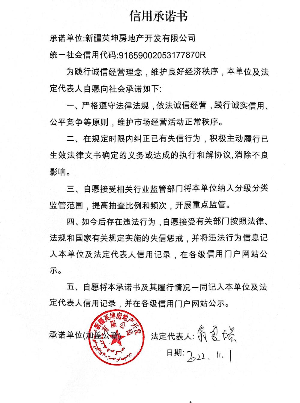 英坤房地产公司--信用承诺书