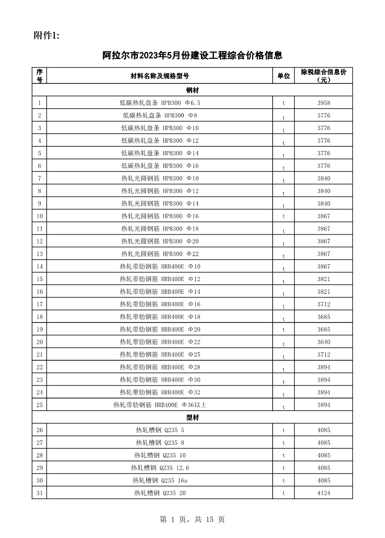 附件1:阿拉尔市2023年5月份建设工程价格信息
