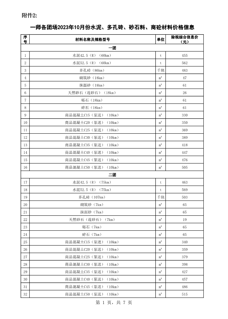 附件2:一师各团场2023年10月份水泥、多孔砖、砂石料、商砼材料价格信息