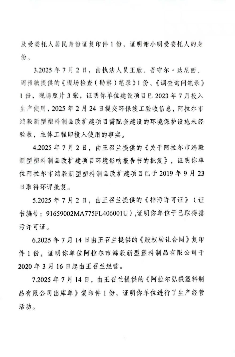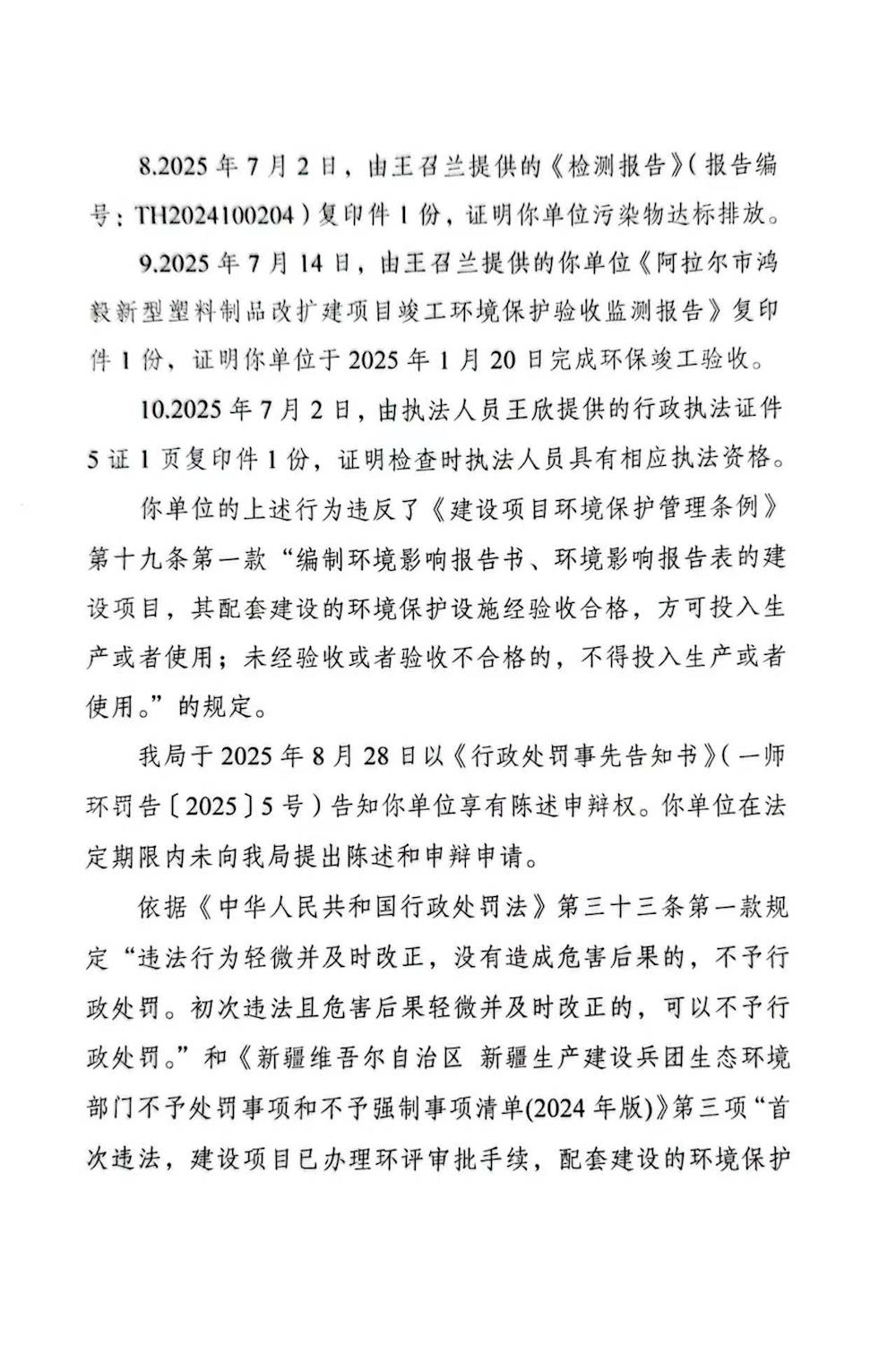 关于阿拉尔市弘毅塑料制品有限公司《不予行政处罚决定书》的公示