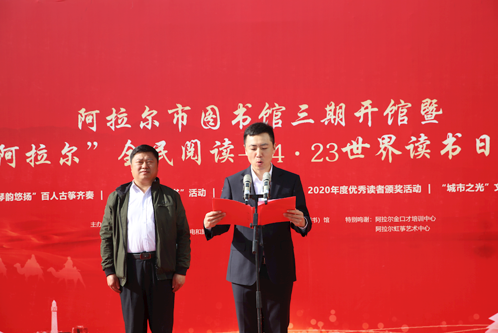 4月22日上午,师市举办阿拉尔市图书馆城市书房分馆开馆仪式暨“书香阿拉尔”全民阅读──4·23世界读书日系列活动,师市党委常委、副师长韩若昊出席经开区城市书房揭牌仪式并致辞。师市人大党组成员、副主任,工商联主席康小平同志,青松路街道党工委书记、办事处主任宋卫才同志出席活动。经开区党工委委员、管委会副主任王昊同志主持开馆仪式。