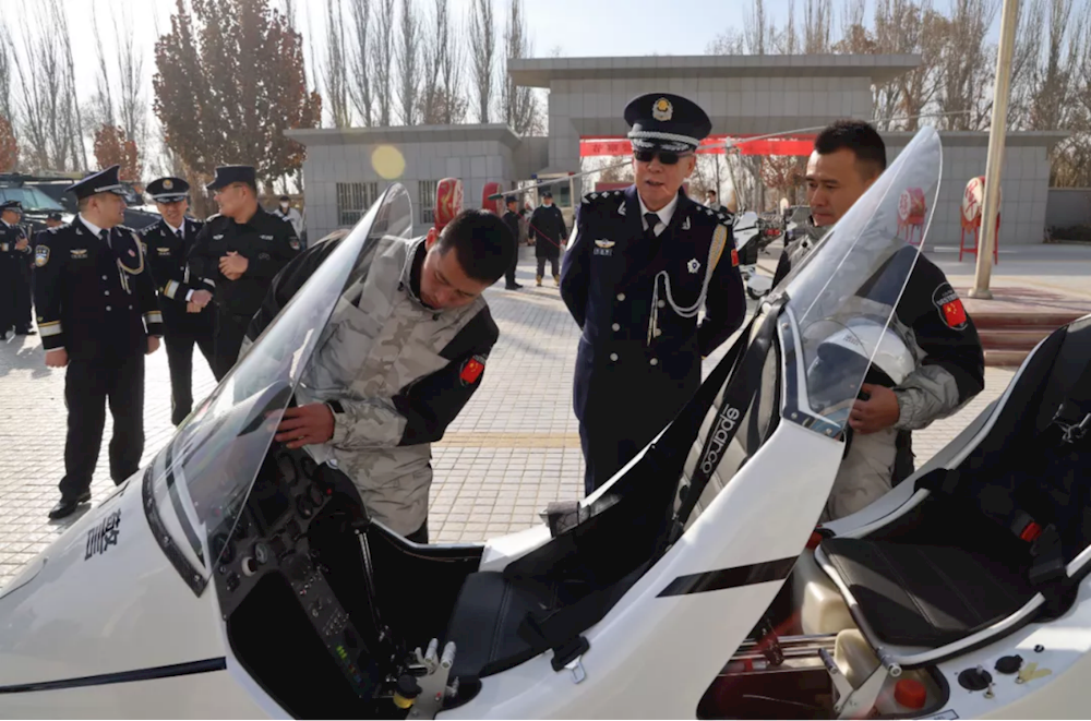 局党委班子成员向特警支队发放自转旋翼机钥匙并颁发证书。