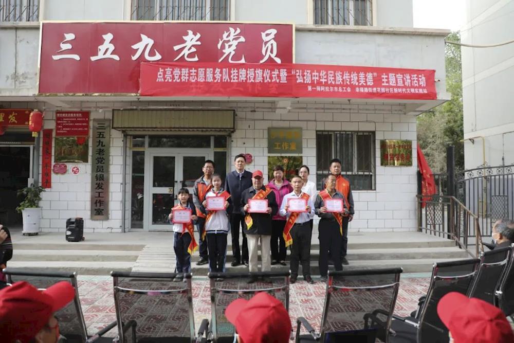 4月23日,由师市总工会主办,幸福路街道花园社区承办的点亮党群志愿服务队挂牌授旗仪式暨“弘扬中华民族传统美德”主题宣讲活动在新苑小区举行,活动为点亮党群志愿服务队挂牌授旗,并为首批队员颁发聘书,随后,点亮党群志愿服务队进行了首场志愿服务宣讲。