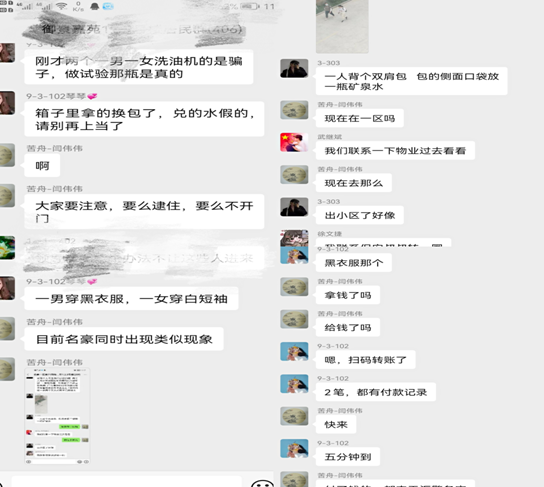 据受害人黄女士称,6月4日端午节期间,一位自称销售油烟机清洁剂的工作人员敲响她家大门,介绍一款油烟机清洁剂的功能,并当场试用其效果。清洁效果让黄女士很是满意,不想,在销售人员走后,黄女士拆开包装发现自己所购买的清洁剂并没有刚才试用的效果,都是清水。这让黄女士很是气愤,便将此事发至该小区网格群内。当日学苑社区代班领导闫伟伟得知此事后,立即根据受害人黄女士所提供的线索,利用网格群、监控、各网格保安的作用,实时关注此事,追踪行骗人员。