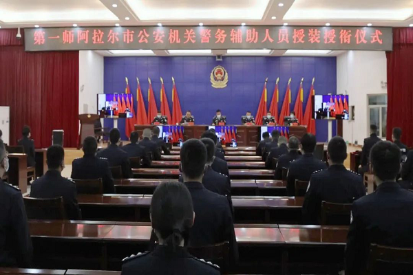 仪式宣读了第一师阿拉尔市公安机关警务辅助人员层级化评定的通报,并为各警种辅警代表授装、授衔。