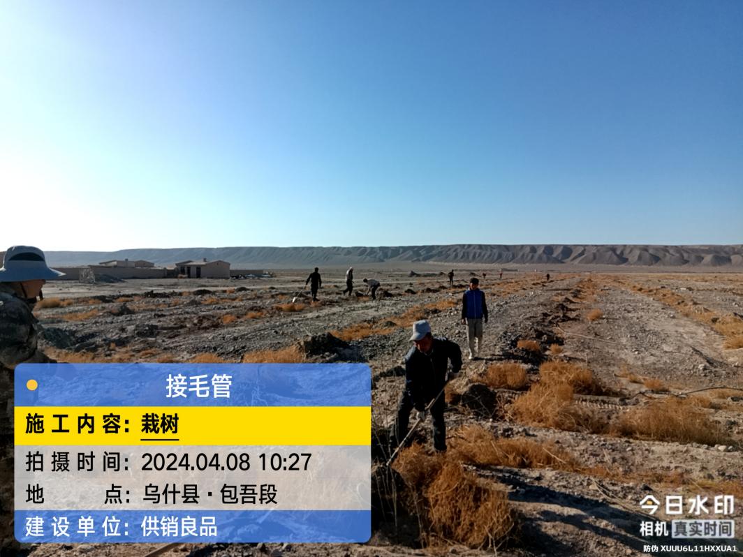 在栽树过程中,供销良品公司四团作业点负责人宋浩胜严格按照公司要求把控栽树质量,确保每一棵树苗都能健康生长。同时,铺面管、接毛管等工作也在同步进行中,采用了边栽边滴的种植方式,确保栽树后及时滴水,栽树滴水不过夜,以提高成活率。