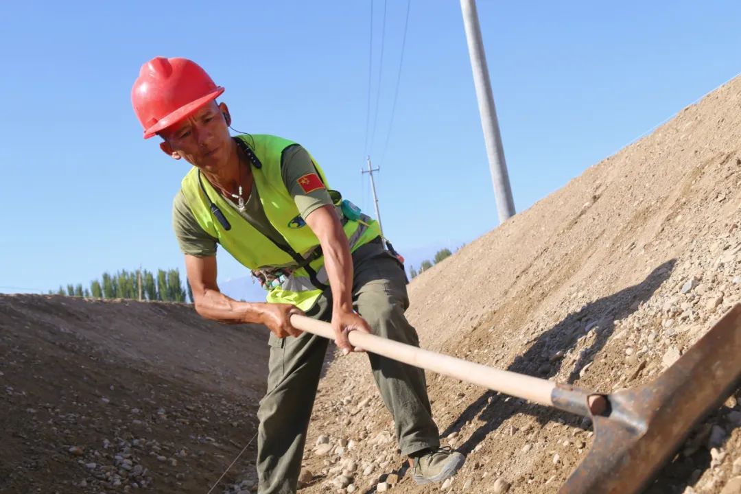 9月26日,在四团八连到十一连二干三支渠施工现场,工人师傅们正在配合机械平整渠道斜坡、铺装渠道底部预制板、修建桥涵,抓紧施工,保证团场农业冬灌顺利进行。四团二干三支渠是八连、九连、十一连三个连队共用的一条农业灌溉兼顾排涝泄洪的主要输水渠道,控制灌溉面积7800亩,1998年修建。由于长时间的使用,工程老化失修,部分渠道受水力冲刷和冻胀作用,裂缝、崩塌严重、输水能力下降,渗漏严重,而且渠道高度不够,水量增加时容易造成溢水,再加上渠系老化,渠系水利用率低,水利工程不能正常发挥效益。