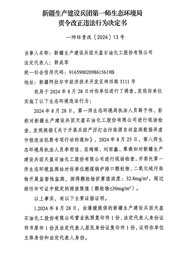关于新疆生产建设兵团天盈石油化工股份有限公司《责令改正违法行为决定书》的公示