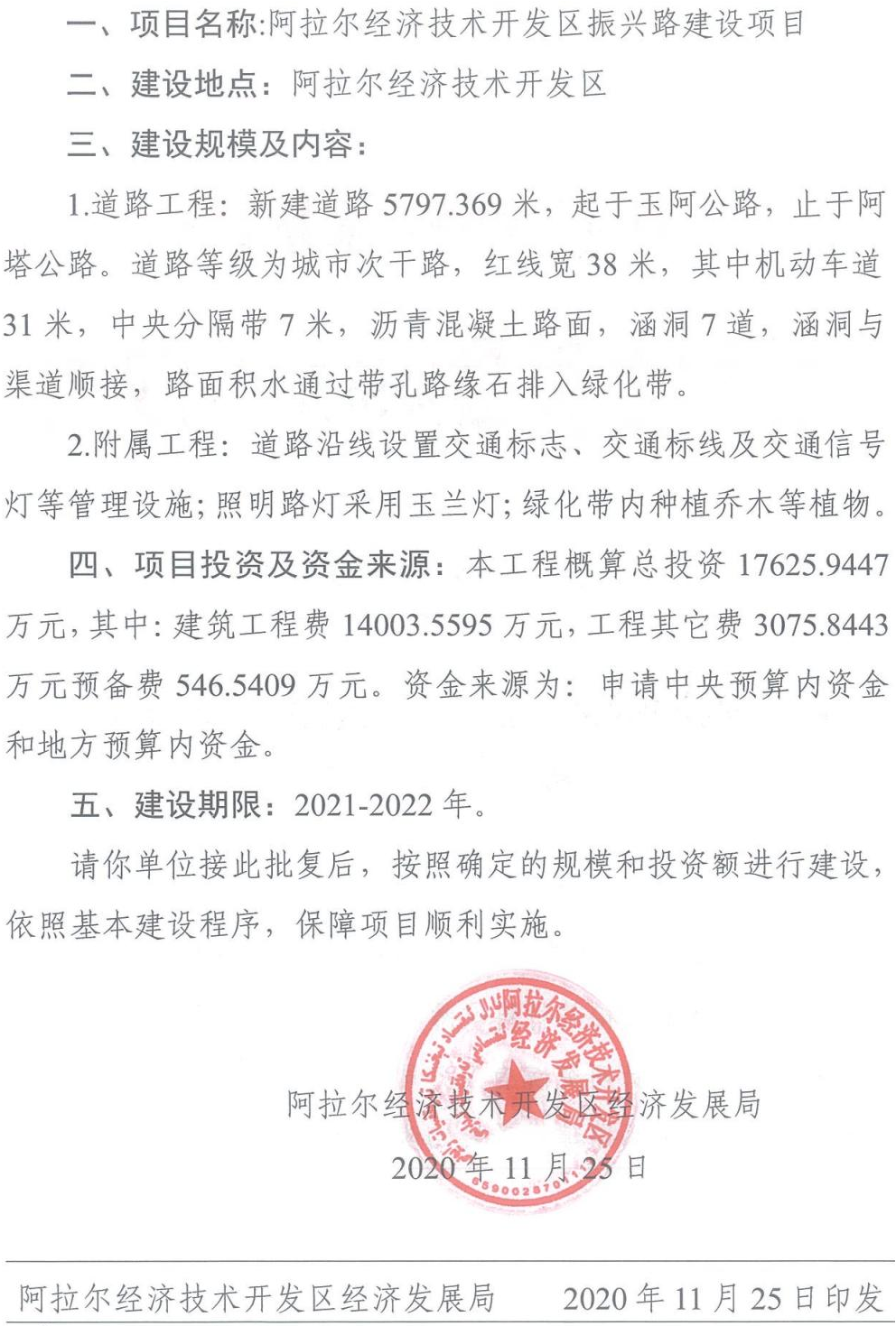 阿拉尔经济技术开发区振兴路建设项目初步设计已经阿拉尔经济技术开发区经济发展局审核通过,建设项目选址意见书已由阿拉尔经济技术开发区规划建设局核发。《阿拉尔经济技术开发区振兴路建设项目初步设计的批复》(阿经开经发〔2020〕84号)、《建设项目选址意见书》(选字第2021-02号)与本方案一并公示。