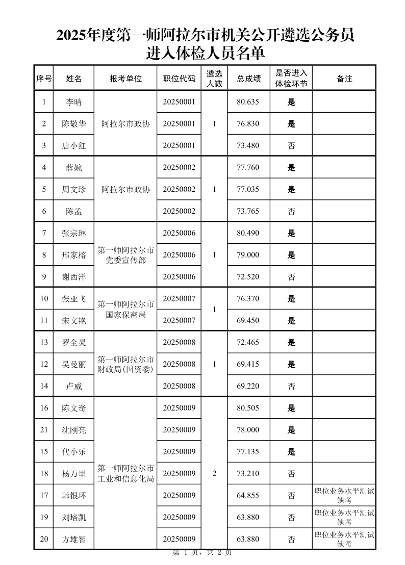 根据2025年度第一师阿拉尔市机关公开遴选公务员工作安排,现将进入体检环节人员名单及相关事宜告知如下:
