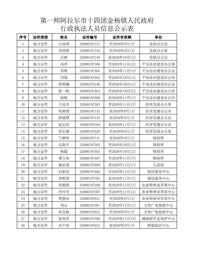 十四团金杨镇人民政府行政执法人员信息公示表