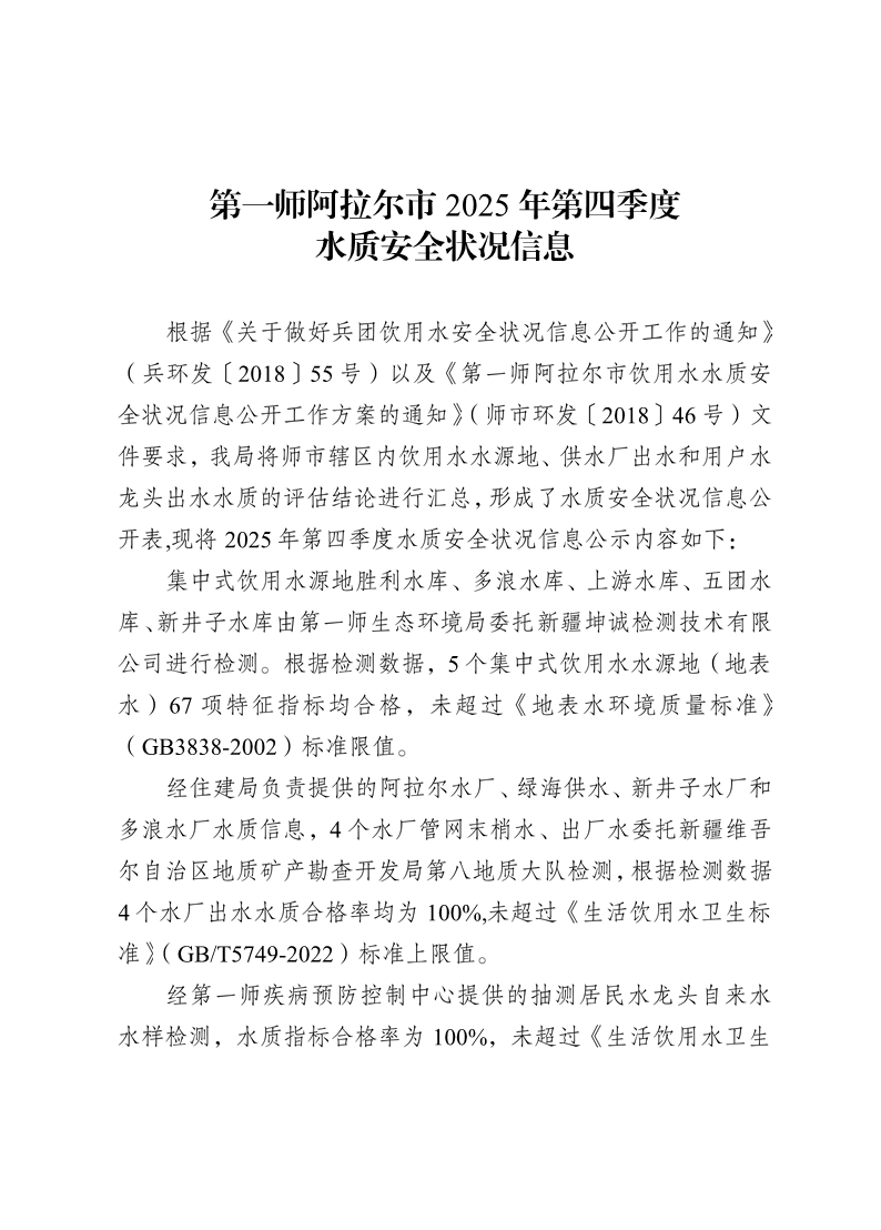第一师阿拉尔市2025年第四季度饮用水水质公开