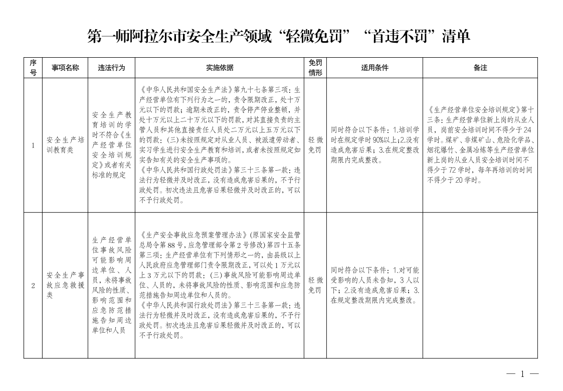 关于印发《第一师阿拉尔市安全生产领域 “轻微免罚”“首违不罚”清单》的通知