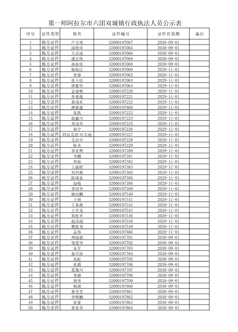 第一师阿拉尔市六团双城镇执法人员信息