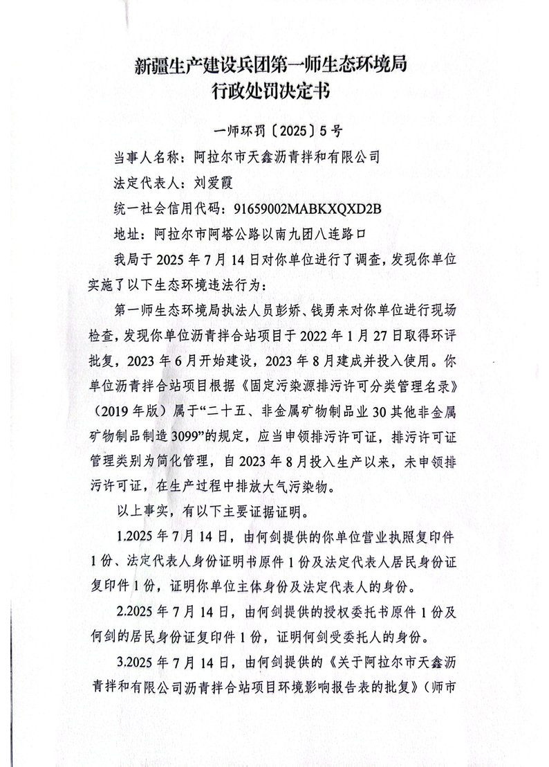 关于阿拉尔市天鑫沥青拌和有限公司《行政处罚决定书》的公示