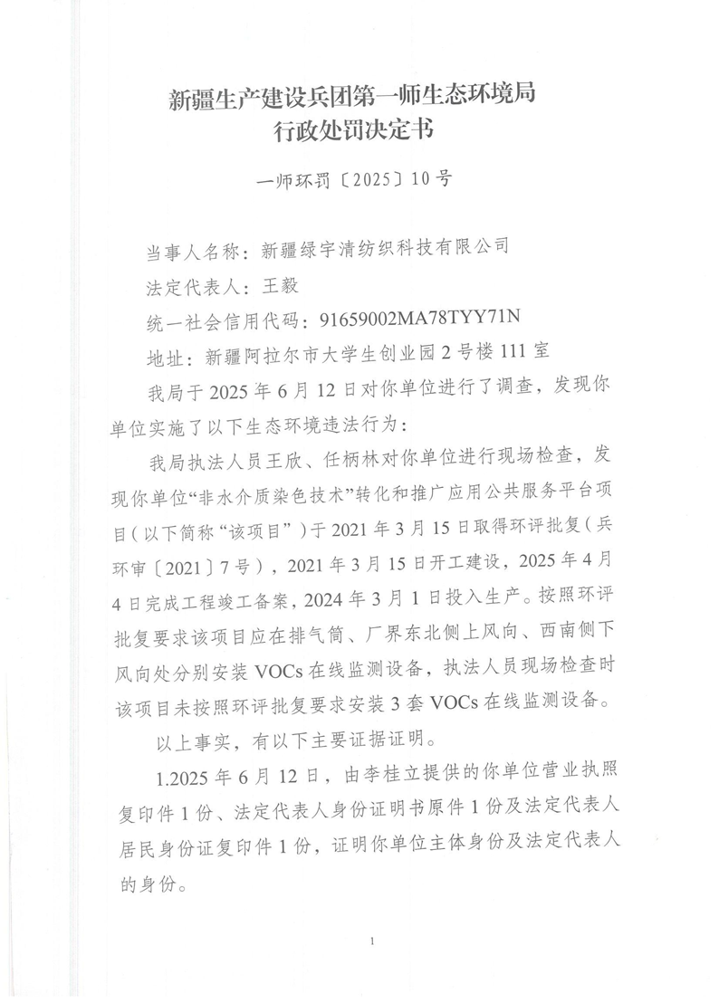 关于新疆绿宇清纺织科技有限公司《行政处罚决定书》的公示