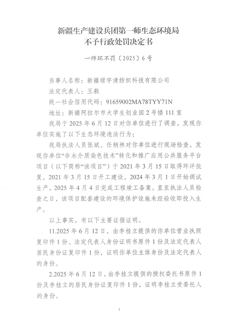 关于新疆绿宇清纺织科技有限公司不予行政处罚(一师环不罚〔2025〕6号)的公示 来源:生态环境局 发布时间:2025-09-08 19:45:47 浏览次数: 次 【字体:小 大】 终审:生态环境局 【打印正文】