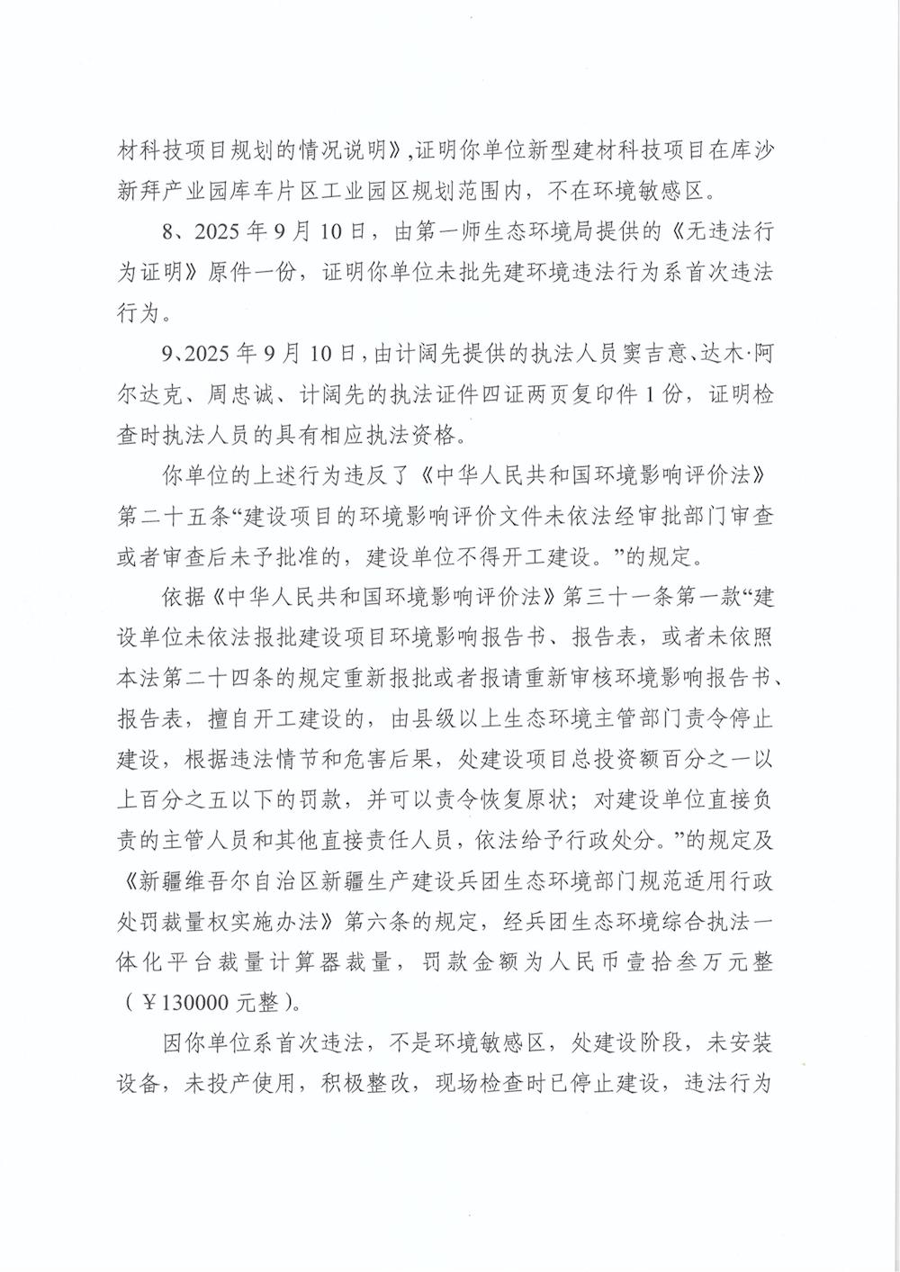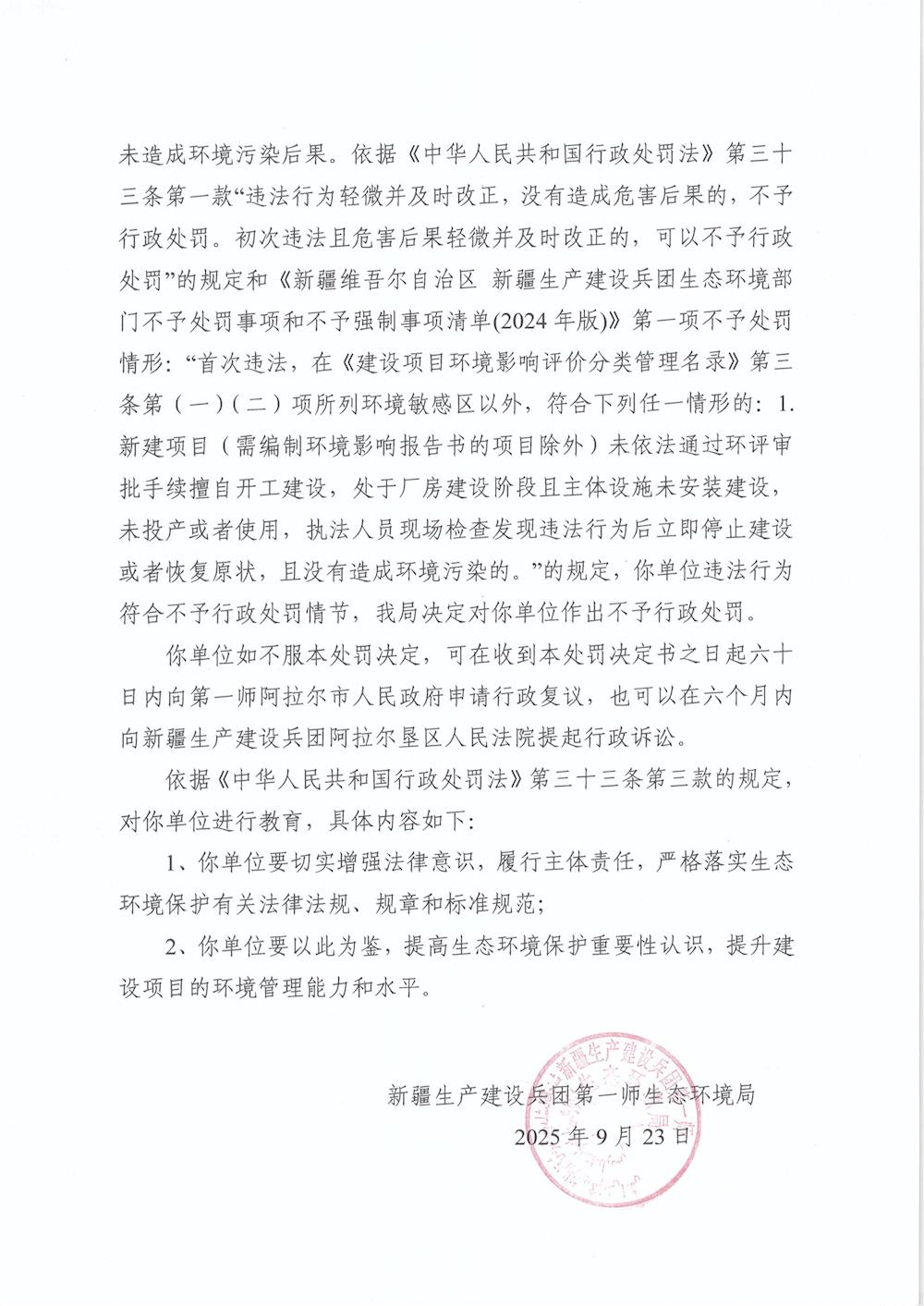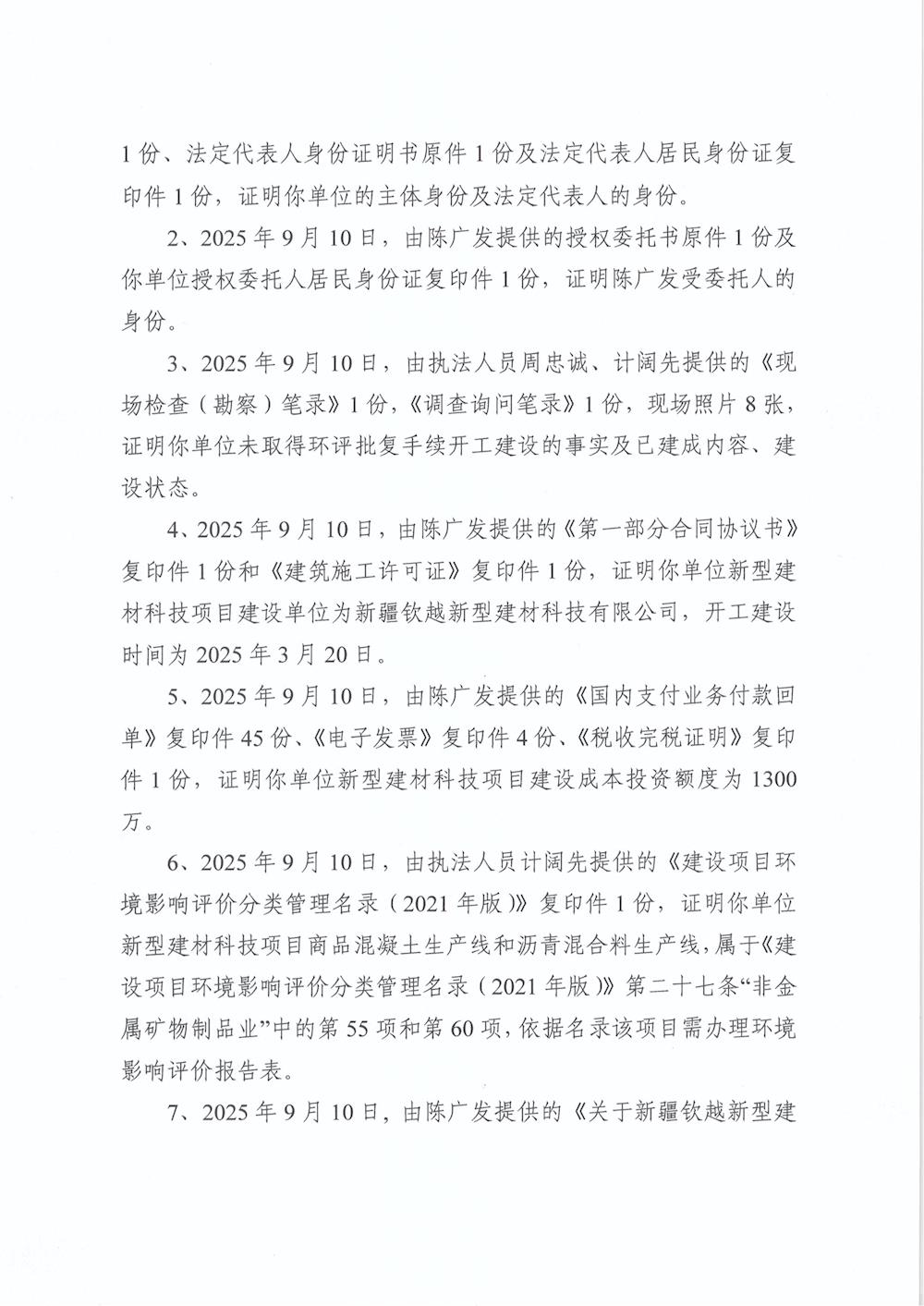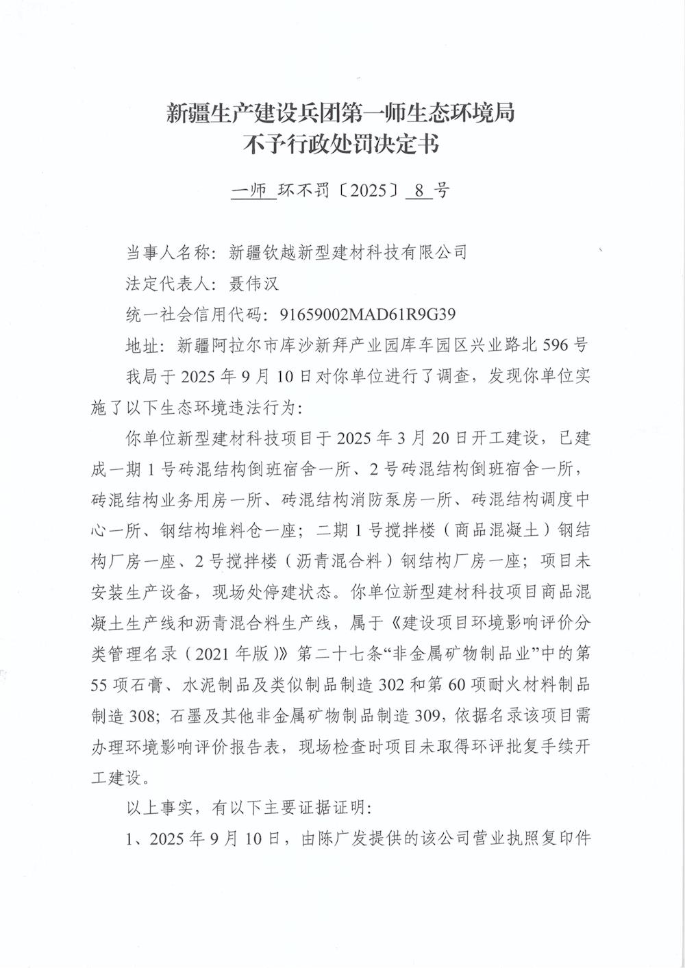 关于新疆钦越新型建材科技有限公司《不予行政处罚决定书》的公示