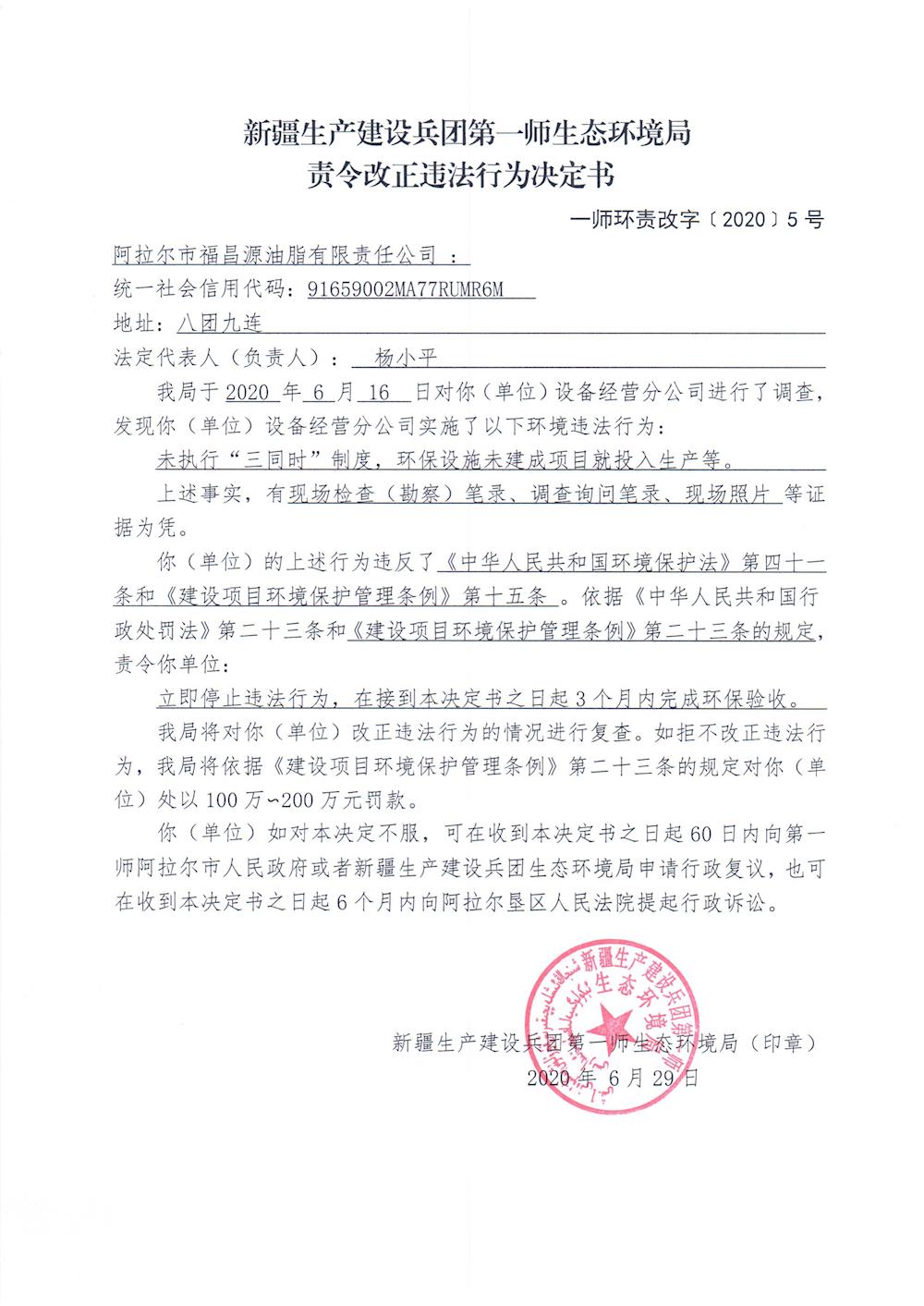 阿拉尔市福昌源油脂有限公司责令改正违法行为决定书公示